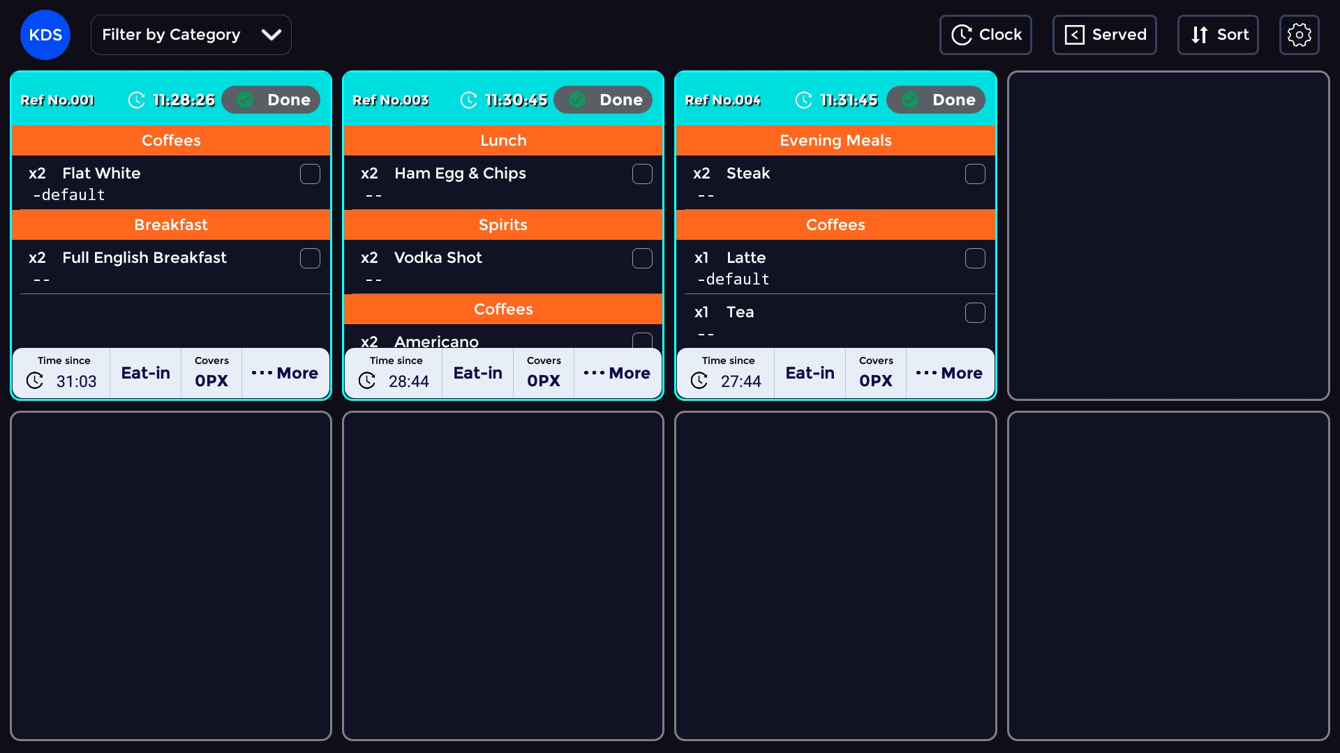 The KDS Screen allows chefs to easily see what orders are coming through and what needs cooking at a given time.