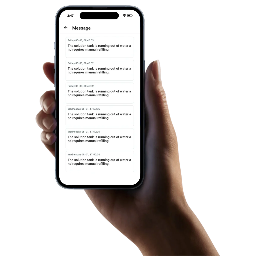 Receive live alerts from the robot such as when the robot is running low on charge or when the water tank needs refilling.