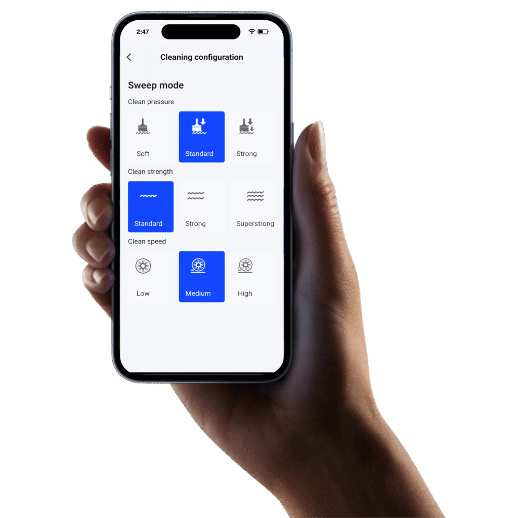 Configure Phantas’ cleaning to suit your preferences by selecting the cleaning mode and adjusting parameters such as pressure, strength, and speed.
