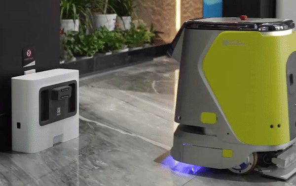 Powered by a high-capacity battery for long operation hours, the robot returns to its charging dock automatically when low on power.
