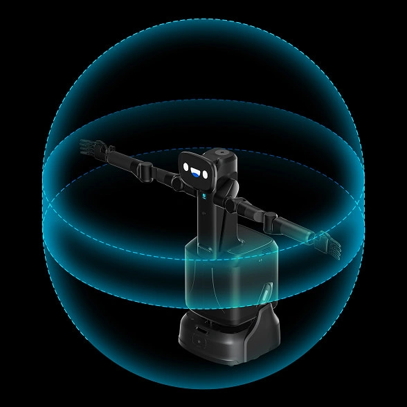 Maximum operating diameter of 2 meters with two robotic arms that can be lifted, capable of handling a wider range of tasks.